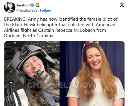 The U.S. Army has officially identified Captain Rebecca M. Lobach, a 28-year-old soldier from Durham, North Carolina, as the third pilot who lost her life in the tragic DC collision cr*sh
